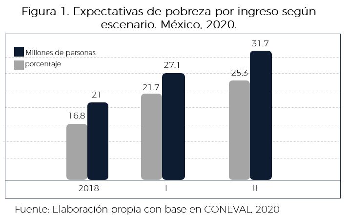 Coneval refiere que el aumento de la pobreza extrema por ingresos, en el escenario más mesurado, es de al menos 4.9 puntos porcentuales, lo que se traduciría en por lo menos 6.1 millones de personas. A este escenario debe sumarse una mayor incidencia de pobreza urbana asociada con los efectos de la crisis, ya que la velocidad de propagación de la COVID19 en zonas urbanas es mayor.