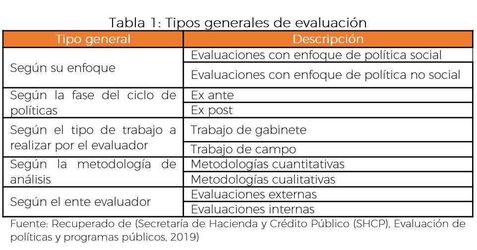 Es importante detenerse aquí, para señalar la diferencia entre la clasificación general de las políticas y la clasificación particular. Esta última deriva de las necesidades y avances de los programas y políticas públicas, algunos ejemplos de estas son las evaluaciones en materia de Diseño, Consistencia y Resultados, Procesos e Impacto. La SHCP y CONEVAL se han encargado de diseñar metodologías para los tipos generales y particulares de políticas públicas.