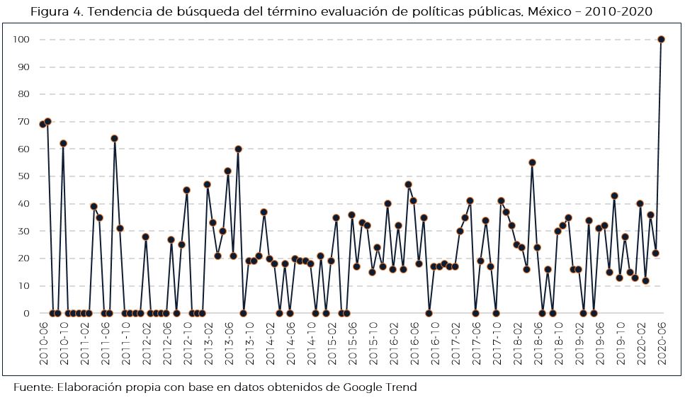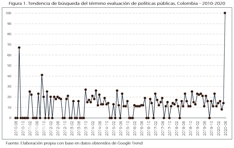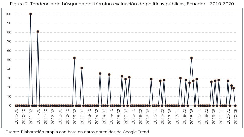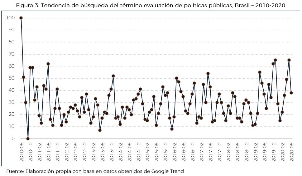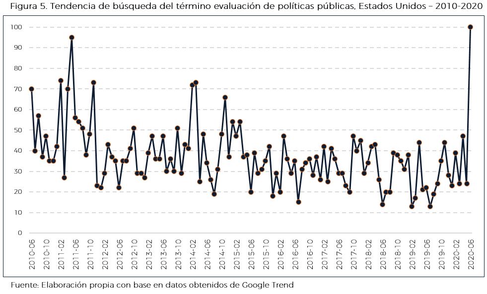 Es así que este análisis se enfoca en la revisión de la tendencia de búsqueda en relación al tema de evaluación con base en las solicitudes temáticas por regiones del concepto de evaluación, a través de la herramienta de Google Trend. A continuación, se muestran los gráficos en los que se puede apreciar la tendencia en un país y periodo determinados. Un valor de 100 indica la ocupación máxima del término evaluación, mientras que 50 y 0 indican que este es la mitad de popular en relación con el valor máximo y que no existen suficientes datos sobre el mismo, respectivamente.