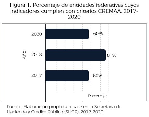 En la figura 1, se observa que, en 2017, 2018 y 2020, el 60, 81 y 60 por ciento de las entidades federativas tenían indicadores construidos con base en los criterios CREMAA, de acuerdo con la medición del avance general en la implementación del PbR-SED, timoneada por la Secretaría de Hacienda y Crédito Público (SHCP). Dado el papel del indicador en la faena de la evaluación, es necesario dirigir esfuerzos para asegurar el cumplimiento total de tales criterios.
