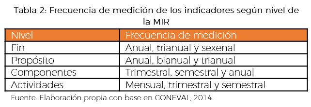 La frecuencia de medición de los indicadores acontece en función del nivel en el cual se encuentran; respecto a la misma, es necesario apuntar que disminuye conforme se cae del nivel en la MIR, justo como se proyecta en la tabla 2.